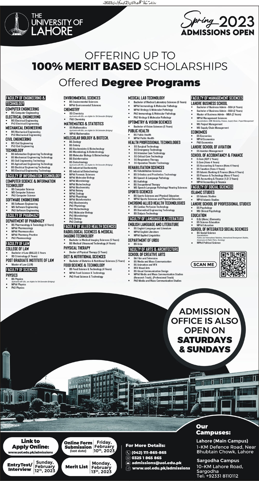 The University of Lahore BS, MS, DPT, MPhil, PhD admissions 2023 has been announced. Eligible students who qualify as per admission criteria in The University of Lahore Lahore Sargodha Punjab Pakistan can apply in Science University for academic year 2023. Students who want to enroll for academic session 2023 in BS, DPT, Phd, Mphil and MS qualification and admission criteria for Government institute can apply till last date 10 February 2023. Read newspaper ad for exact details.