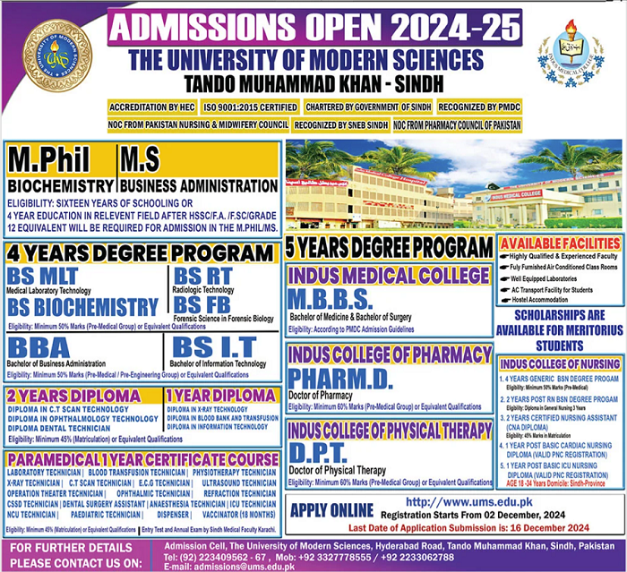 The University of Modern Sciences BS, MS, BBA, MBBS, Pharm D, DPT admissions 2024 has been started. Students who want to take admissions in The University of Modern Sciences Tando Muhammad Khan Sindh Pakistan for academic year 2024 to continue education in Medical University can apply. Students for admissions in BS, Pharm D, MBBS, MS, BBA and DPT & criteria can apply as per Private institute admission policy 2024 before closing date December 16, 2024 as per advertisement. Read newspaper ad for exact details.