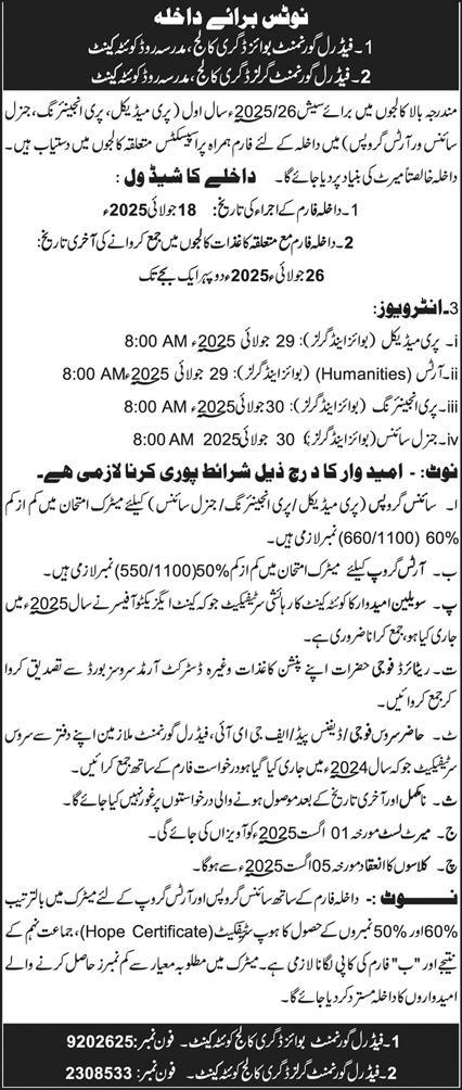 Federal Government Boys Degree College admissions 2025 for BS, MS, MPHIL has been announced. Students can enroll for admissions in Federal Government Boys Degree College Quetta Balochistan Pakistan for academic year 2025 to continue campus based or online education in Science College. Eligible candidates for admissions in can apply as per Government institute criteria and before closing date after reading advertisement online. Read newspaper ad for exact details.
