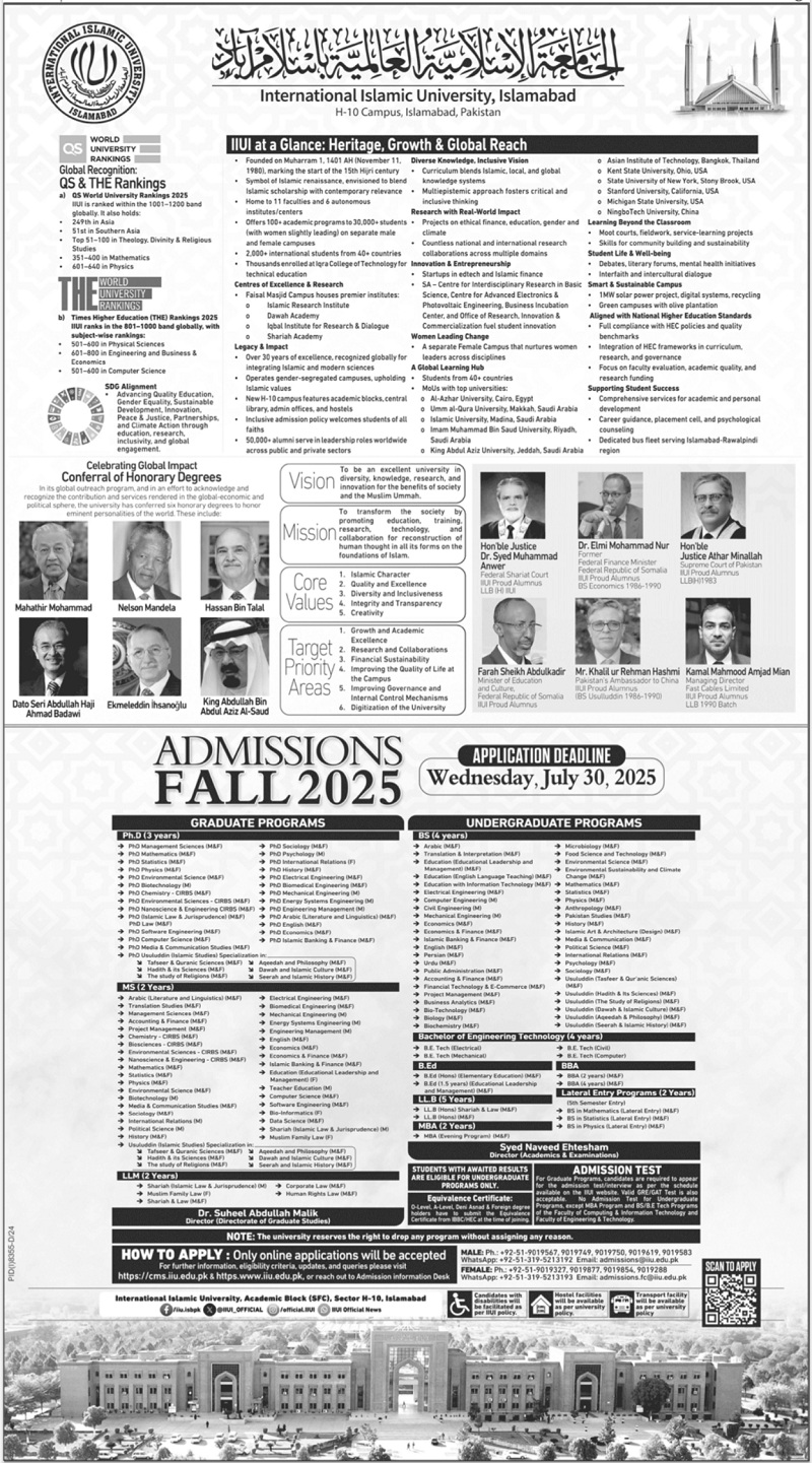 International Islamic University Islamabad IIUI has announced admissions 2025 for BS, MS, MPHIL . International Islamic University Islamabad IIUI Islamabad Islamabad Pakistan welcomes students to apply for admissions in academic year 2025 in Science Medical College. Students who want to enroll for academic session 2025 in qualification and admission criteria for Government institute can apply till last date. Read newspaper ad for exact details.