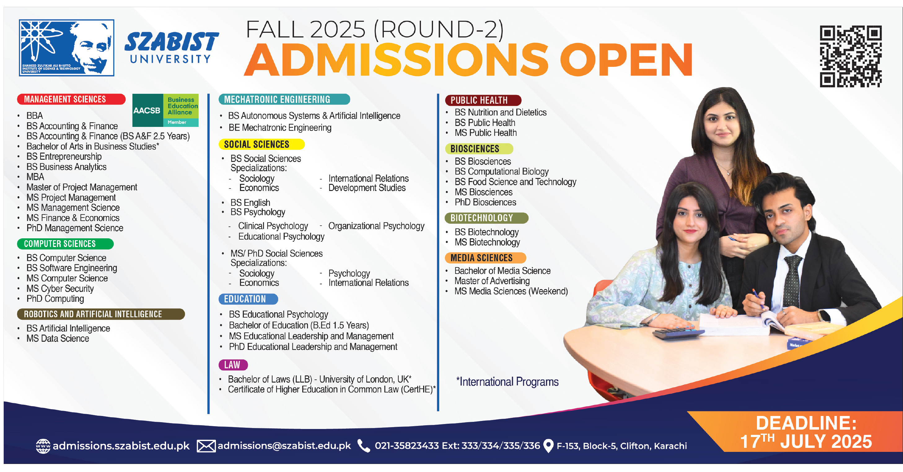 Admissions in Shaheed Zulfiqar Ali Bhutto Institute of Technology SZABIST 2025 for BS, MS, MPHIL has been announced. Eligible students can apply for academic admissions 2025 in Shaheed Zulfiqar Ali Bhutto Institute of Technology SZABIST Karachi Sindh Pakistan for Science University. Students for admissions in can apply for online or campus classes as per Government institute criteria till admission closing date Read newspaper ad for exact details.