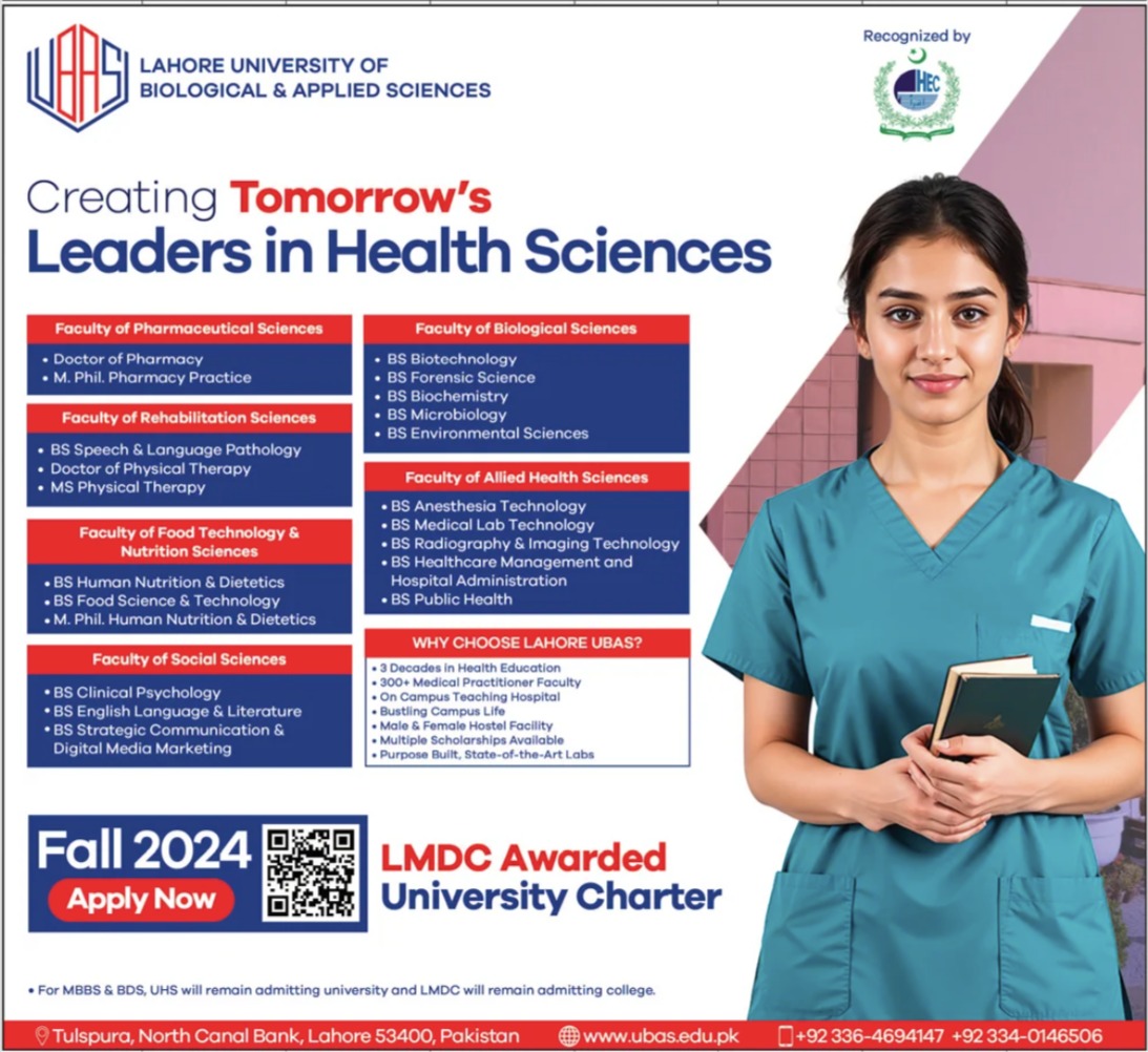 Lahore University of Biological & Applied Sciences LUBAS admissions 2024 for BS, MS, MPhil, PhD has been announced. Eligible students can apply for academic admissions 2024 in Lahore University of Biological & Applied Sciences LUBAS Lahore Punjab Pakistan for Science University. Eligible candidates for admissions in Mphil, MS, BS and Phd can apply as per Private institute criteria and before closing date 24 June 2024 after reading advertisement online. Read newspaper ad for exact details.