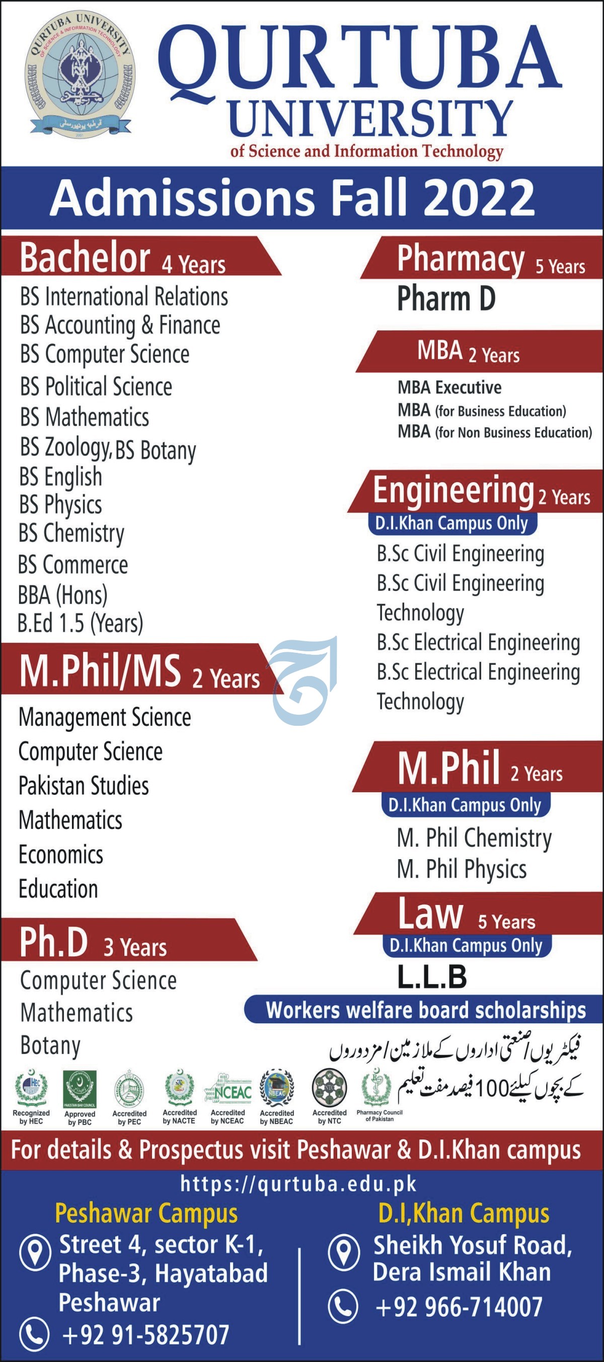 Qurtuba University of Science & Information Technology has announced admissions 2022 for BS International Relations, BS Accounting and Finance, BS Computer Science, MS Management Science, MS Computer Science, BSc Civil Engineering, BSc Electrical Engineering, MPhil Management Science, MPhil Computer Science, Pharm D Doctor of Pharmacy, LLB Bachelor of Law. Students who want to take admissions in Qurtuba University of Science & Information Technology Peshawar Khyber Pakhtunkhwa KPK Pakistan for academic year 2022 to continue education in Science University can apply. Students who want to enroll for academic session 2022 in BCS, B.E, LLb, Phd, BS, BBA, MBA, B.ed, Mphil and MCS qualification and admission criteria for Private institute can apply till last date 18 January 2023. Read newspaper ad for exact details.