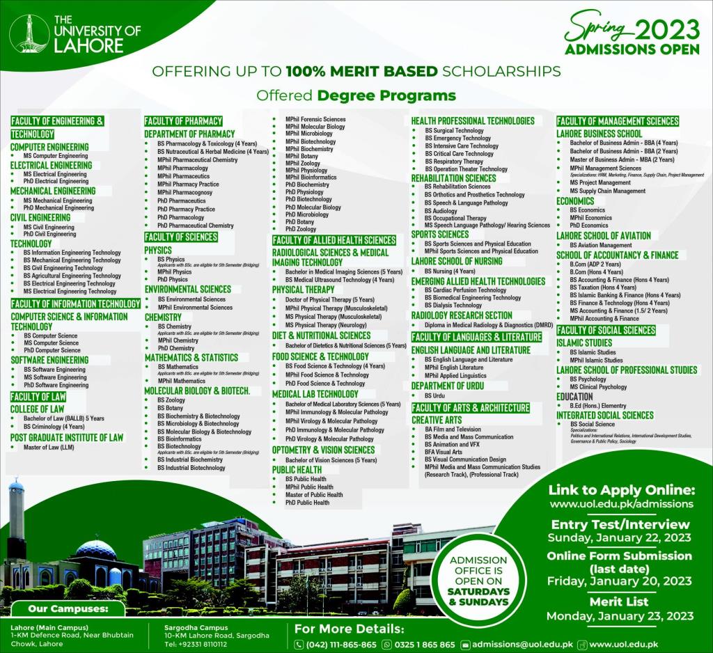 Admissions in The University of Lahore 2023 for BS, MS, LLB, LLM, MPhil, PhD, BCS, B.E has been announced. Students who want to take admissions in The University of Lahore Lahore Sargodha Punjab Pakistan for academic year 2023 to continue education in Management University can apply. Eligible candidates for admissions in Phd, BS, Mphil, LLb, B.com, B.E, DPT, LLM, BCS and MS can apply as per Government institute criteria and before closing date 20 January 2023 after reading advertisement online. Read newspaper ad for exact details.