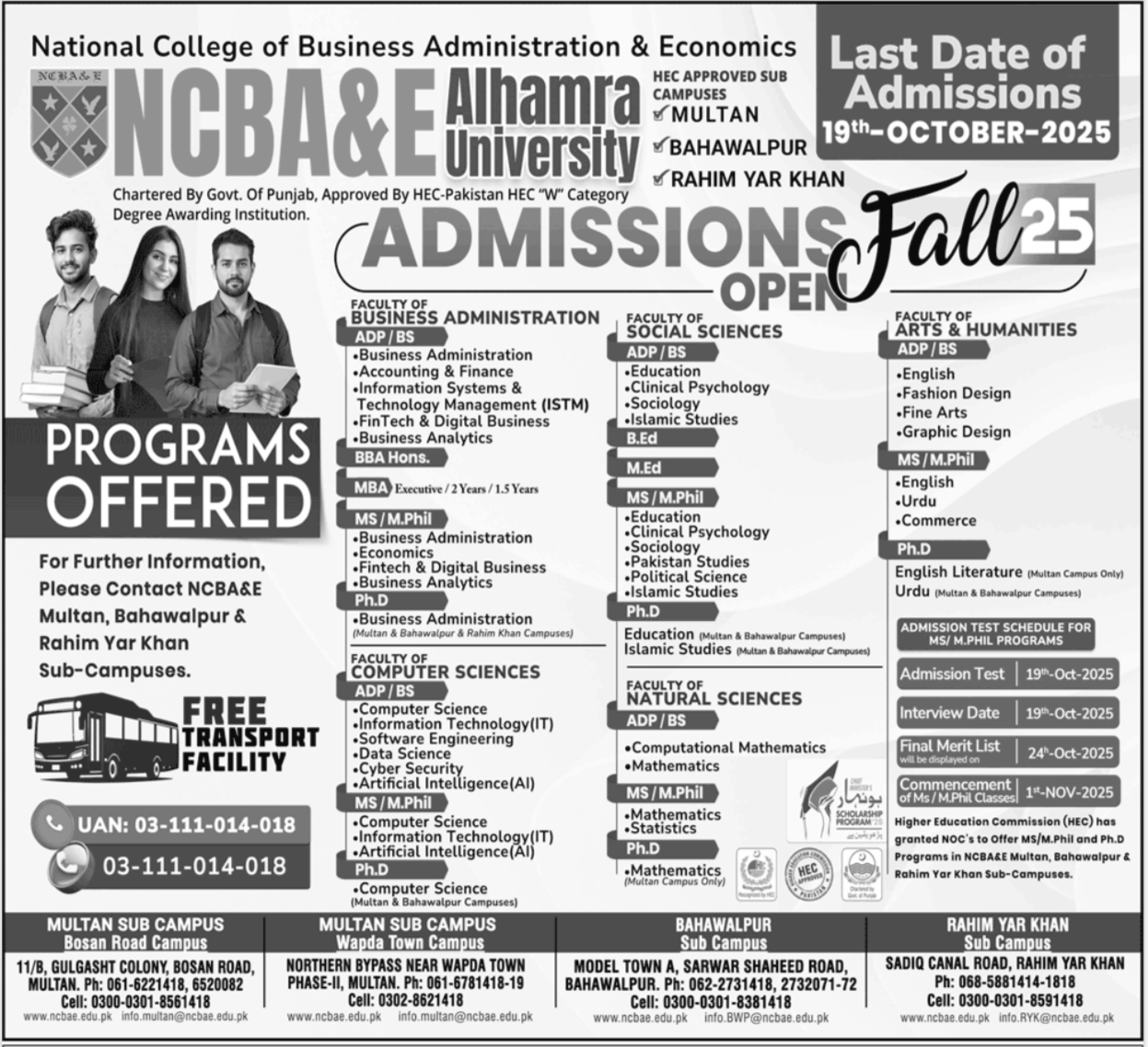 BS, MS, MPHIL, PHD Admissions 2025 open in Alhamra University