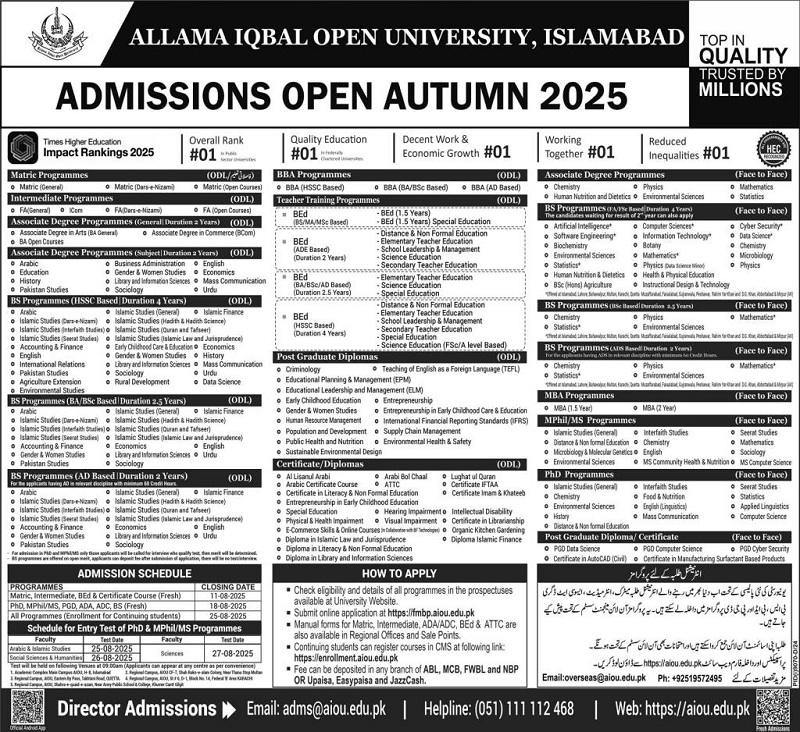 Allama Iqbal Open University AIOU BS, MS, MPHIL, PHD admissions 2025 has been started. Students who want to take admissions in Allama Iqbal Open University AIOU Islamabad Islamabad Pakistan for academic year 2025 to continue education in Science University can apply. Eligible students for fulfilling criteria for admissions in Matric can enroll as per Government admission policy 2025 till closing date. Read newspaper ad for exact details.