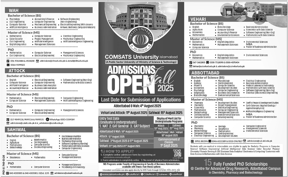 Admissions in Comsats University 2025 for bs has been announced. Students who want to take admissions in Comsats University Lahore Punjab Pakistan for academic year 2025 to continue education in Science University can apply. Students for admissions in can apply for online or campus classes as per Government institute criteria till admission closing date. Read newspaper ad for exact details.