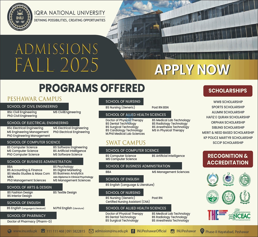 Admissions in Iqra National University 2025 for phd has been announced. Eligible students can apply for academic admissions 2025 in Iqra National University Islamabad Islamabad Pakistan for Science University. Students for admissions in can apply for online or campus classes as per Government institute criteria till admission closing date. Read newspaper ad for exact details.
