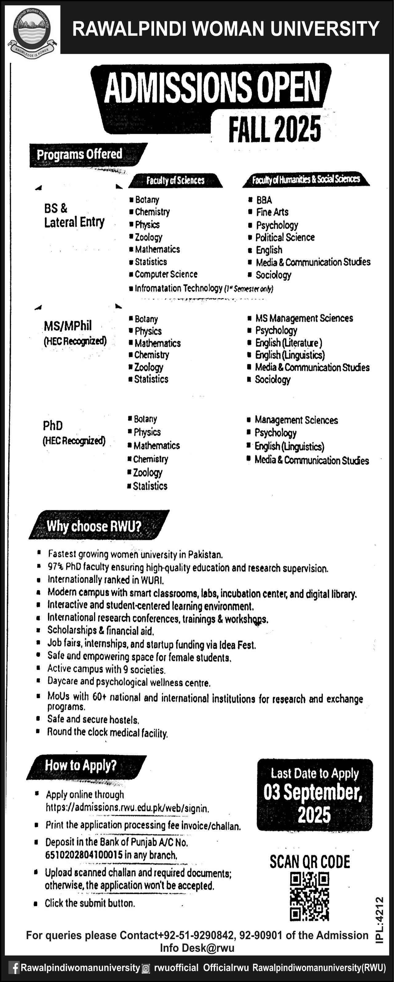Rawalpindi Women University RWU has announced admissions 2025 for BS. Rawalpindi Women University RWU Rawalpindi Punjab Pakistan welcomes students to apply for admissions in academic year 2025 in Science University. Students for admissions in & criteria can apply as per Government institute admission policy 2025 before closing date as per advertisement. Read newspaper ad for exact details.