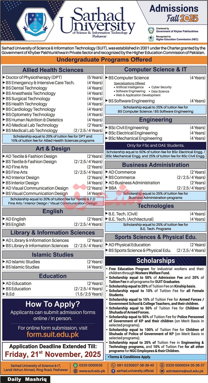 BS, MS, MPHIL, PHD Admissions 2025 open in Sarhad University