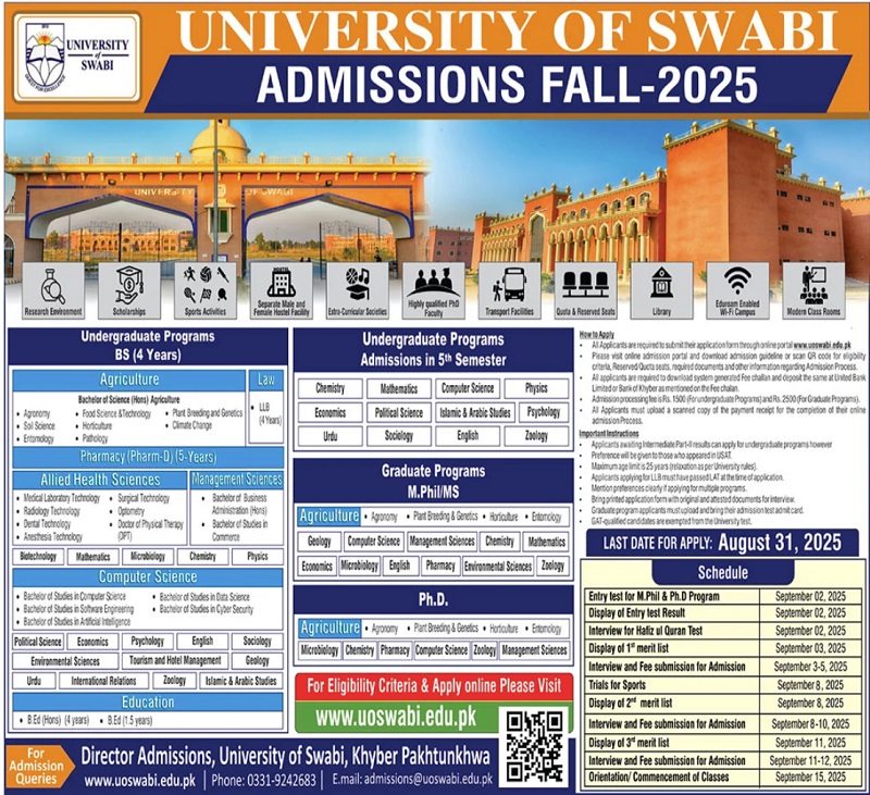 BS, MS, MPHIL, PHD Admissions 2025 open in University of Swabi
