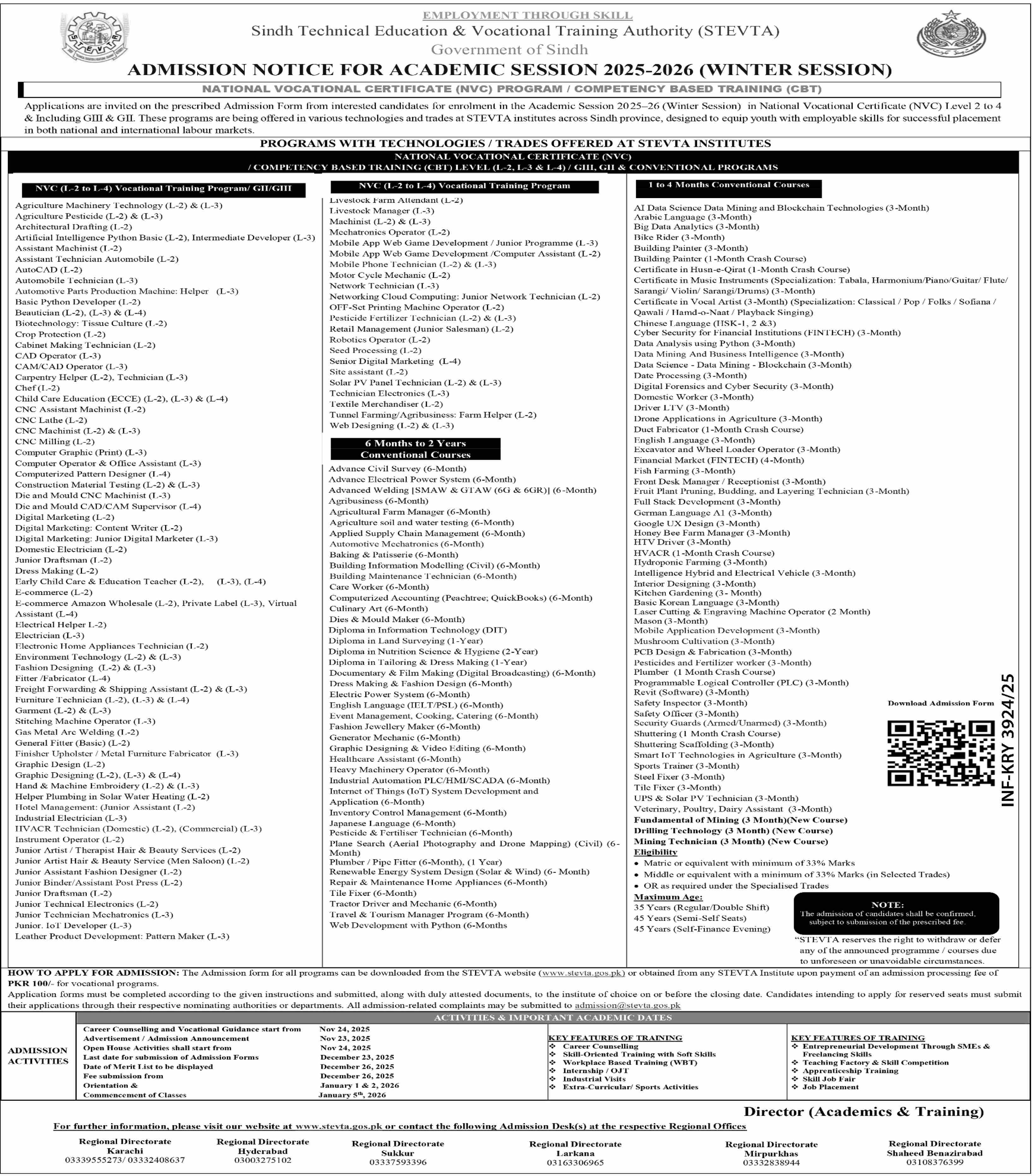 Sindh Technical Education and Vocational Training Authority STEVTA admissions 2025 for BS has been announced. Sindh Technical Education and Vocational Training Authority STEVTA Karachi Sindh Pakistan welcomes students to apply for admissions in academic year 2025 in Science University. Eligible candidates for admissions in can apply as per Government institute criteria and before closing date after reading advertisement online. Read newspaper ad for exact details.