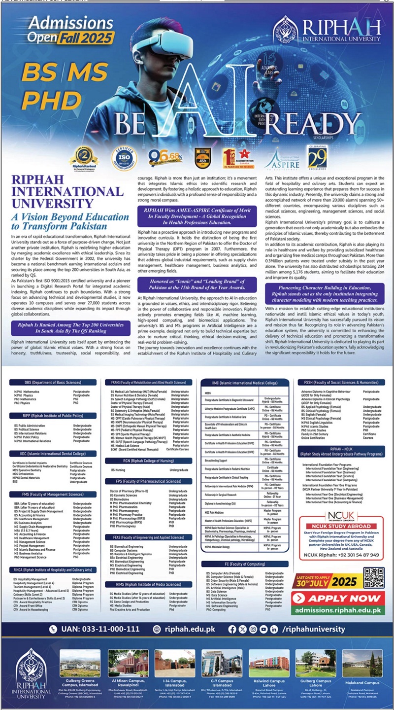 RIPAH International University has announced admissions 2025 for BS, MS, PHD . RIPAH International University Islamabad Islamabad Pakistan welcomes students to apply for admissions in academic year 2025 in Engineering University. Students for admissions in can apply for online or campus classes as per Government institute criteria till admission closing date Read newspaper ad for exact details.