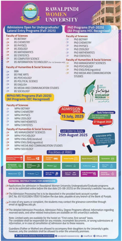 Admissions in Rawalpindi Women University RWU 2025 for bs has been announced. Eligible students who qualify as per admission criteria in Rawalpindi Women University RWU Rawalpindi Punjab Pakistan can apply in Science University for academic year 2025. Students for admissions in can apply for online or campus classes as per Government institute criteria till admission closing date. Read newspaper ad for exact details.