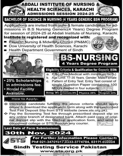 Abdali Institute of Nursing and Health Sciences has announced admissions 2024 for BS Nursing. Eligible students can apply for academic admissions 2024 in Abdali Institute of Nursing and Health Sciences Karachi Sindh Pakistan for Medical College. Students for admissions in BSN can apply for online or campus classes as per Private institute criteria till admission closing date November 30, 2024. Read newspaper ad for exact details.