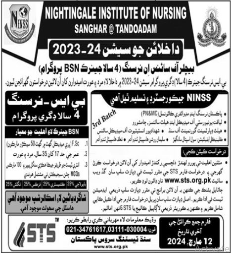 Admissions in Nightingale Institute of Nursing 2024 for BS Nursing has been announced. Nightingale Institute of Nursing Sanghar Tando Adam Sindh Pakistan welcomes students to apply for admissions in academic year 2024 in Medical University. Students for admissions in BSN can apply for online or campus classes as per Private institute criteria till admission closing date April 3, 2024. Read newspaper ad for exact details.