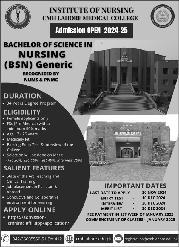 CMH Lahore Medical College BS Nursing admissions 2024 has been announced. Eligible students can apply for academic admissions 2024 in CMH Lahore Medical College Lahore Punjab Pakistan for Medical Medical College. Eligible students for fulfilling criteria for admissions in BSN can enroll as per Private admission policy 2024 till closing date 30 November 2024. Read newspaper ad for exact details.