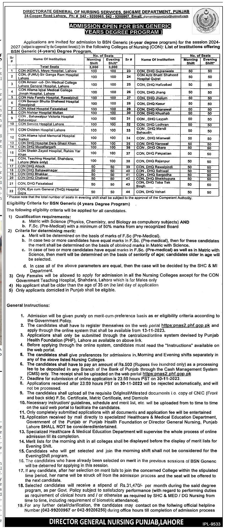 Specialized Healthcare & Medical Education Department BSN Nursing admissions 2023 has been announced. Specialized Healthcare & Medical Education Department Lahore Bahawalpur, Sialkot, Faisalabad, Rawalpindi, Chakwal, Multan, , Dera Ghazi Khan, Bahawalnagar, Attock, Rahim Yar Khan and Muzaffargarh Punjab Pakistan welcomes students to apply for admissions in academic year 2023 in Medical University. Eligible candidates for admissions in BSN can apply as per Government institute criteria and before closing date 30 November 2023 after reading advertisement online. Read newspaper ad for exact details.