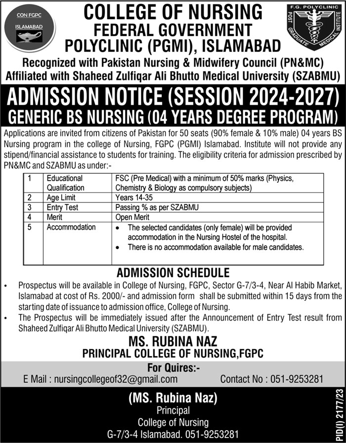 Admissions in Federal Government PolyClinic FGPC 2023 for BS Nursing has been announced. Eligible students who qualify as per admission criteria in Federal Government PolyClinic FGPC Islamabad Islamabad Pakistan can apply in Medical College for academic year 2023. Students for admissions in BSN can apply for online or campus classes as per Government institute criteria till admission closing date October 23, 2023. Read newspaper ad for exact details.