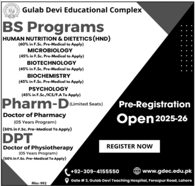 Admissions in Gulab Devi Educational Complex GDEC 2025 for BS, Pharm-D, DPT has been announced. Students can enroll for admissions in Gulab Devi Educational Complex GDEC Karachi Sindh Pakistan for academic year 2025 to continue campus based or online education in Medical College. Students who want to enroll for academic session 2025 in qualification and admission criteria for Government institute can apply till last date. Read newspaper ad for exact details.