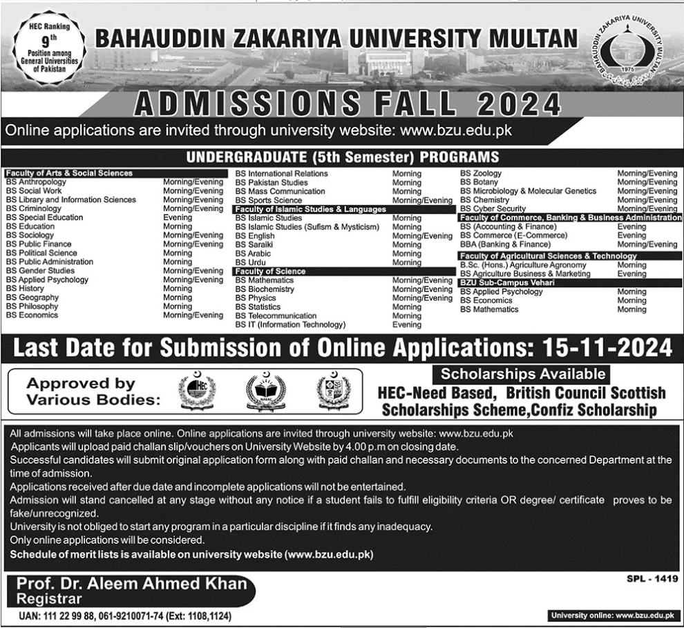 BS Program admissions at Bahauddin Zakariya University Multan BZU