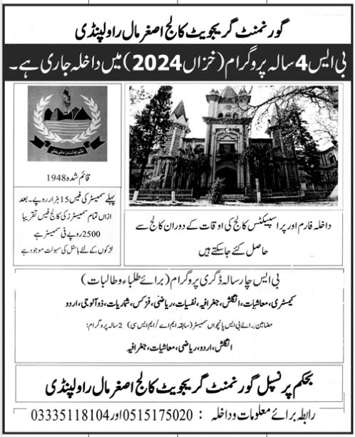 Government Graduate College has announced admissions 2024 for BS Programs. Eligible students can apply for academic admissions 2024 in Government Graduate College Rawalpindi Punjab Pakistan for Arts College. Eligible candidates for admissions in Bachelor and BS can apply as per Government institute criteria and before closing date 30 September 2024 after reading advertisement online. Read newspaper ad for exact details.