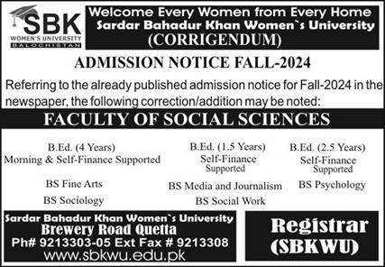 Sardar Bahadur Khan University SBK Women University has announced admissions 2024 for BS Programs, B.Ed Programs. Eligible students who qualify as per admission criteria in Sardar Bahadur Khan University SBK Women University Quetta Balochistan Pakistan can apply in Science University for academic year 2024. Eligible candidates for admissions in Bachelor, BS and B.ed can apply as per Government institute criteria and before closing date 11 November 2024 after reading advertisement online. Read newspaper ad for exact details.