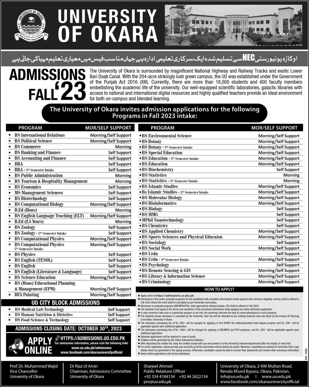 University Of Okara 2 KM Multan Road Renala Khurd By Pass, Okara-Pakistan Tel: 044-26