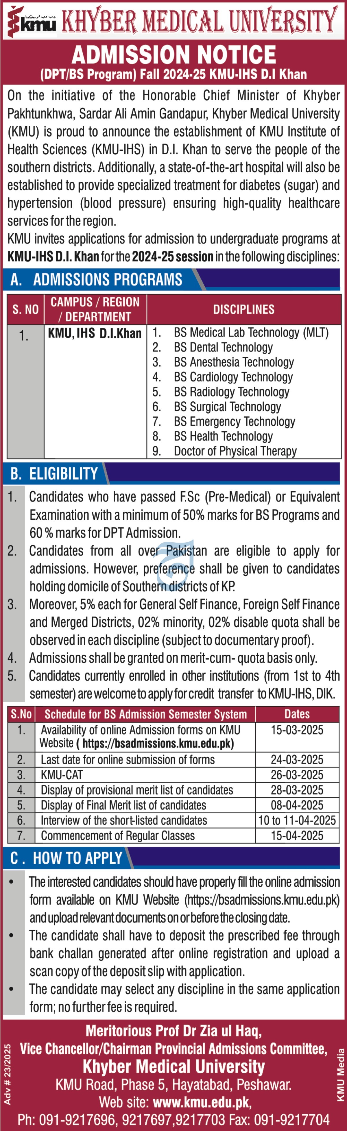 Khyber Medical University Peshawar admissions 2025 for BS Programs has been announced. Students who want to take admissions in Khyber Medical University Peshawar Peshawar Khyber Pakhtunkhwa KPK Pakistan for academic year 2025 to continue education in Medical University can apply. Students for admissions in can apply for online or campus classes as per Government institute criteria till admission closing date. Read newspaper ad for exact details.