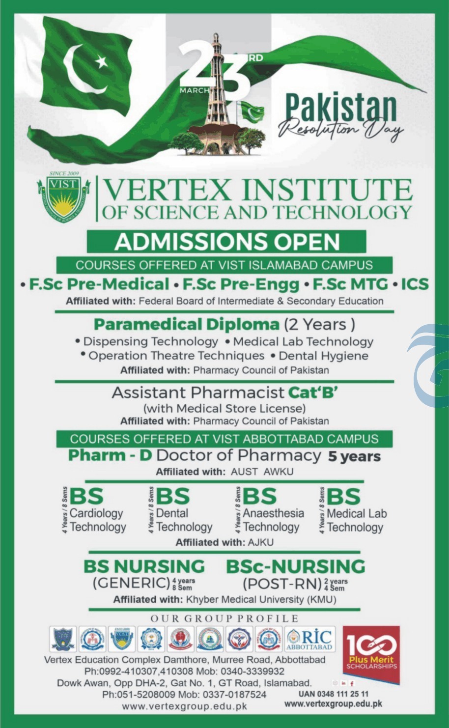 Vertex Institute Of Science And Technology BS Programs admissions 2025 has been announced. Eligible students who qualify as per admission criteria in Vertex Institute Of Science And Technology Islamabad Islamabad Pakistan can apply in Science University for academic year 2025. Students who want to enroll for academic session 2025 in qualification and admission criteria for Private institute can apply till last date. Read newspaper ad for exact details.