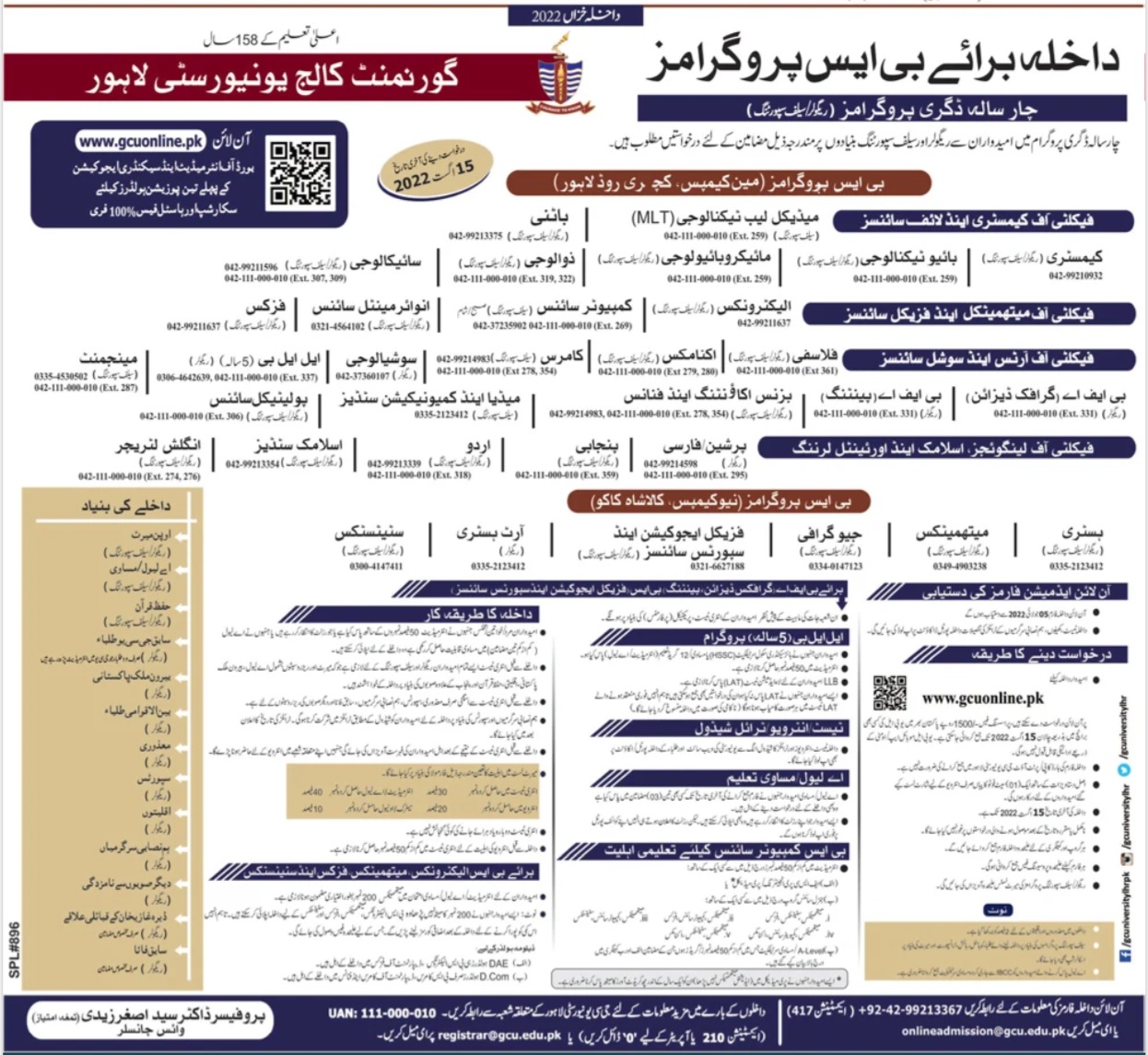 BS Programs Admissions Announced In Government College University lahore