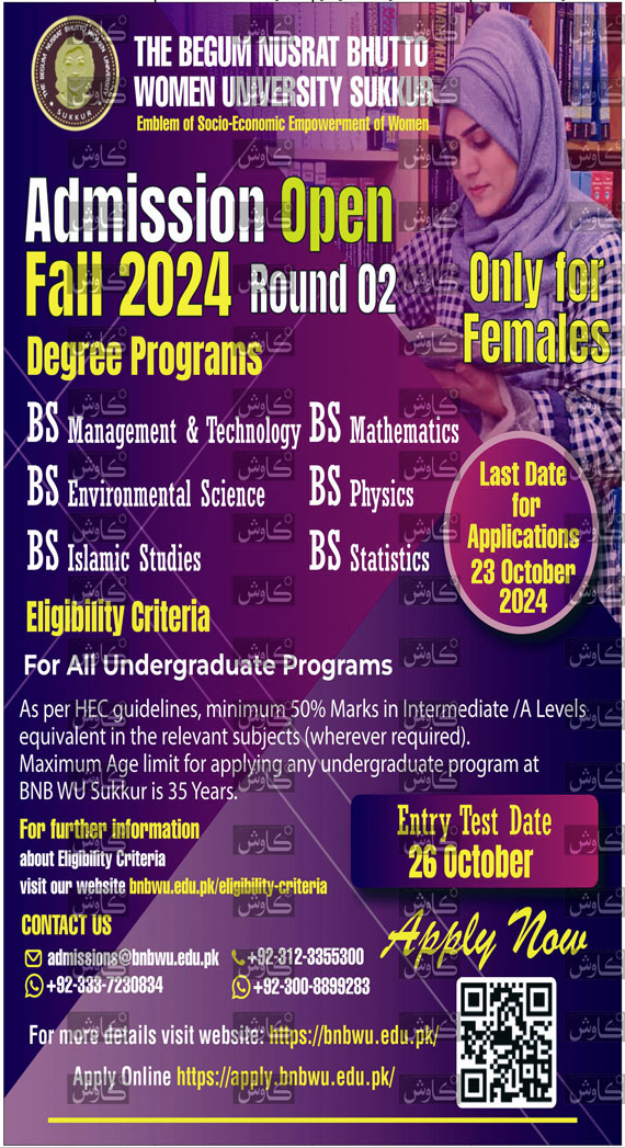 The Begum Nusrat Bhutto Women University has announced admissions 2024 for BS Programs. Students who want to take admissions in The Begum Nusrat Bhutto Women University Sukkur Sindh Pakistan for academic year 2024 to continue education in Science University can apply. Eligible candidates for admissions in Bachelor and BS can apply as per Private institute criteria and before closing date 23 October 2024 after reading advertisement online. Read newspaper ad for exact details.
