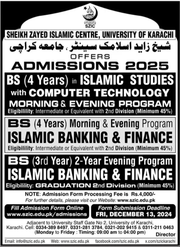 University of Karachi BS Islamic Studies, BS Islamic Banking and Finance admissions 2024 has been started. Students who want to take admissions in University of Karachi Karachi Sindh Pakistan for academic year 2024 to continue education in Science University can apply. Eligible candidates for admissions in Bachelor and BS can apply as per Government institute criteria and before closing date 13 December 2024 after reading advertisement online. Read newspaper ad for exact details.