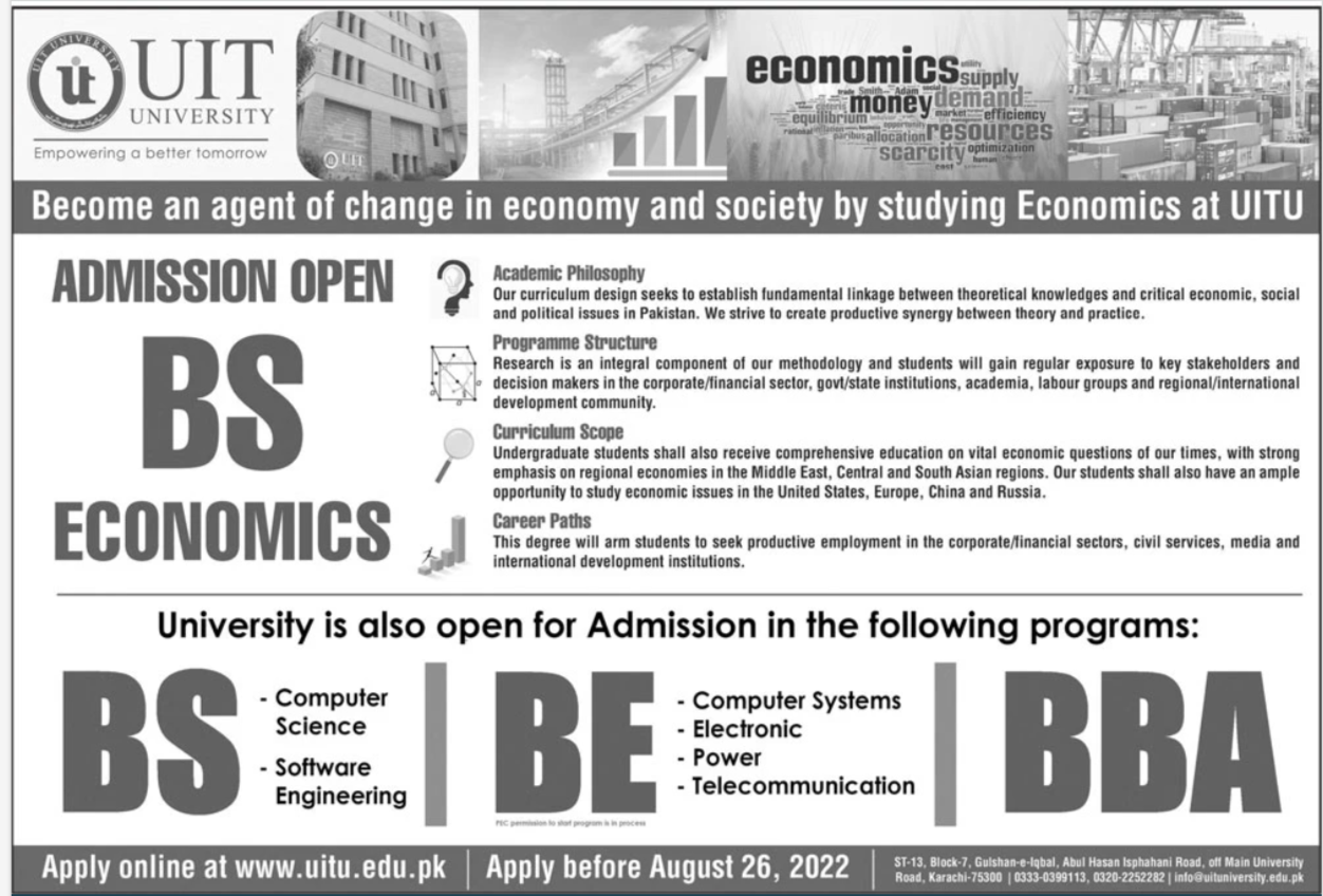 UIT University bs economics, bs computer science, BE Computer system admissions 2022 has been started. Eligible students can apply for academic admissions 2022 in UIT University Karachi Sindh Pakistan for Management Graduate. Eligible candidates for admissions in Intermediate can apply as per Private institute criteria and before closing date after reading advertisement online. Read newspaper ad for exact details.