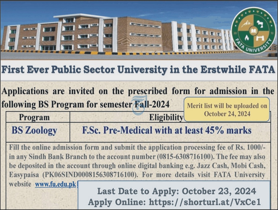 Admissions in Fata University 2024 for BS Zoology has been announced. Students can enroll for admissions in Fata University Kohat Khyber Pakhtunkhwa KPK Pakistan for academic year 2024 to continue campus based or online education in Medical University. Students who want to enroll for academic session 2024 in BS qualification and admission criteria for Government institute can apply till last date 23 October 2024. Read newspaper ad for exact details.