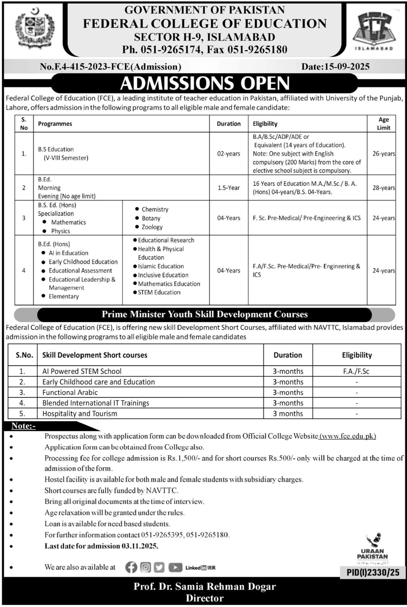 Federal College of Education FCE BSC admissions 2025 has been announced. Eligible students can apply for academic admissions 2025 in Federal College of Education FCE Islamabad Islamabad Pakistan for Science College. Students for admissions in can apply for online or campus classes as per Government institute criteria till admission closing date. Read newspaper ad for exact details.
