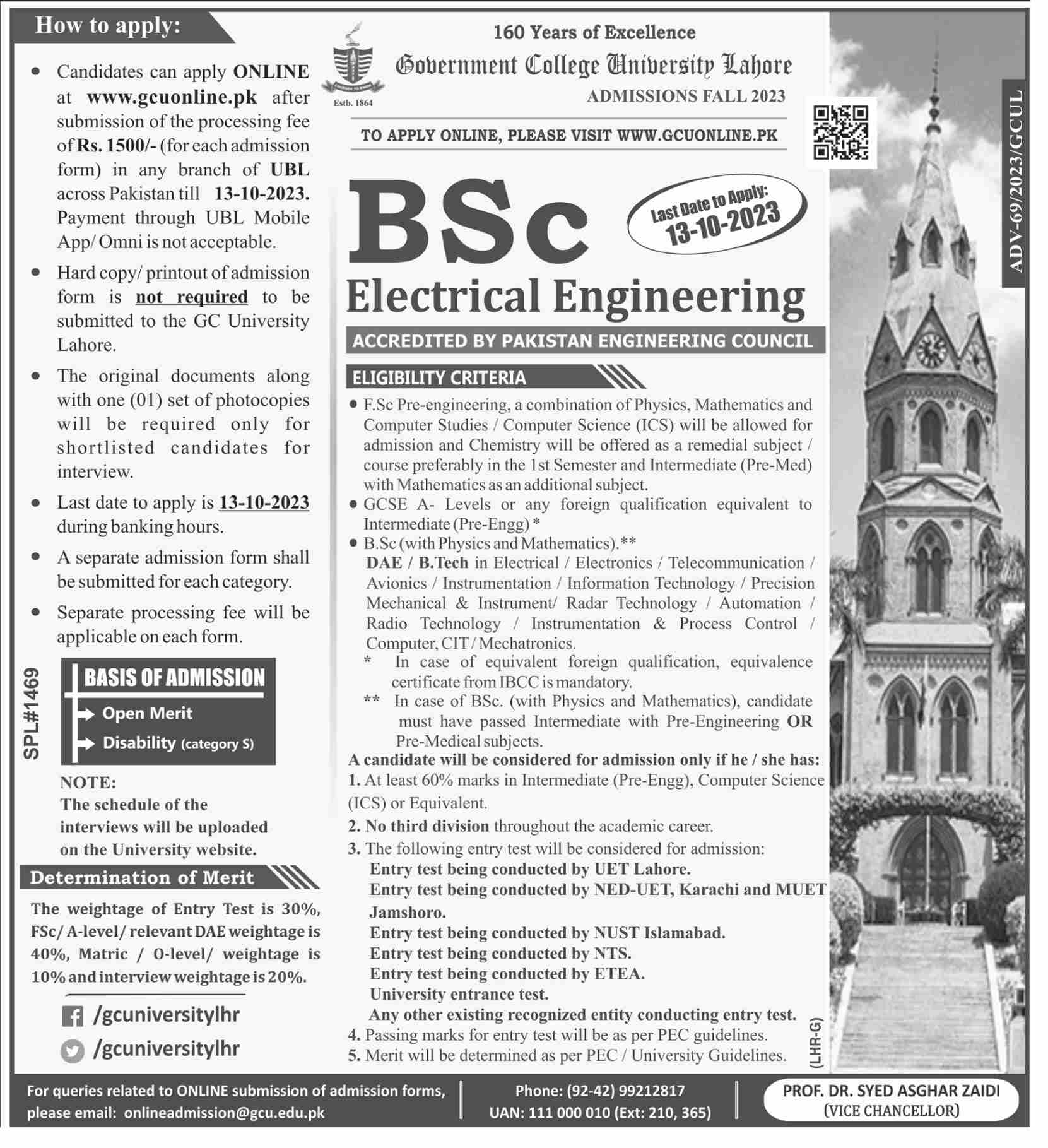 Government College University BSc Electrical Engineering admissions 2023 has been announced. Government College University Lahore Punjab Pakistan welcomes students to apply for admissions in academic year 2023 in Engineering AIOU. Students for admissions in Bachelor, BS and B.E can apply for online or campus classes as per Government institute criteria till admission closing date October 13, 2023. Read newspaper ad for exact details.