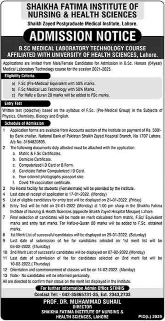 Shaikha Fatima Institute of Nursing and Health Sciences BSc Medical Laboratory Technology Course admissions 2022 has been started. Eligible students can apply for academic admissions 2022 in Shaikha Fatima Institute of Nursing and Health Sciences Lahore Punjab Pakistan for University. Eligible students with qualification criteria BS and Bachelor can enroll as per Private admission policy 2022 till closing date 17 January 2022. Read newspaper ad for exact details.