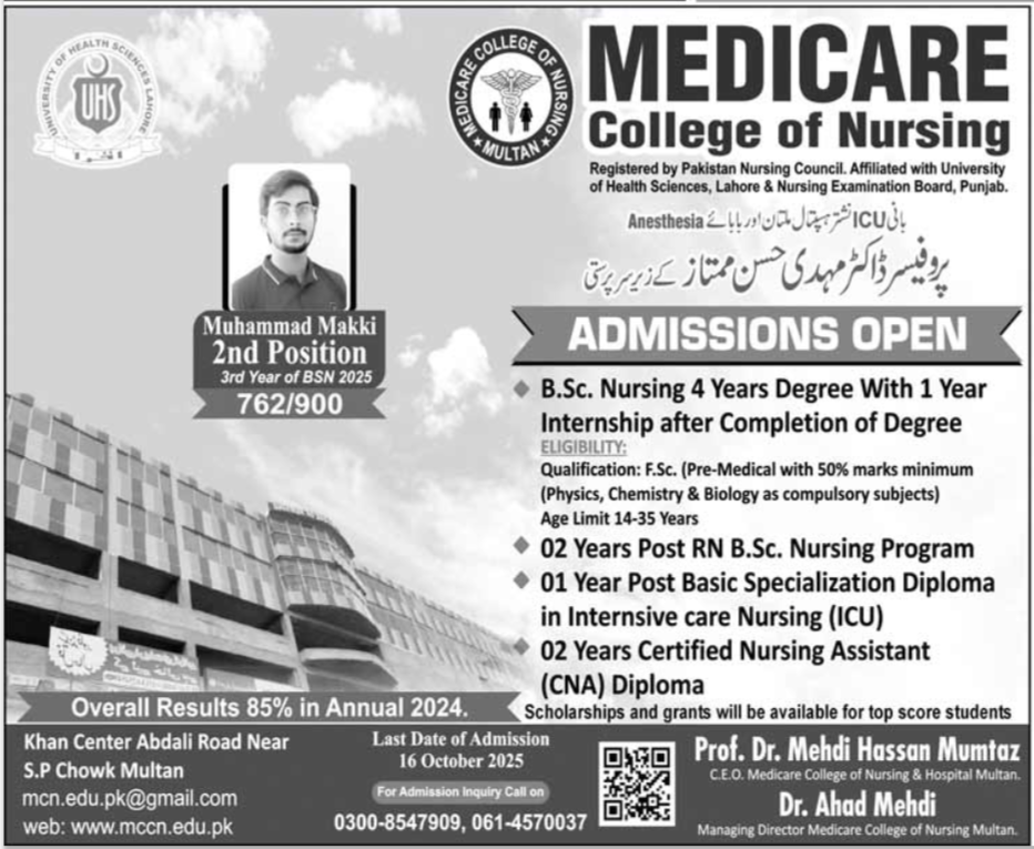Medicare College Of Nursing bsc admissions 2025 has been started. Eligible students can apply for academic admissions 2025 in Medicare College Of Nursing Karachi Sindh Pakistan for Science College. Students for admissions in can apply for online or campus classes as per Government institute criteria till admission closing date. Read newspaper ad for exact details.