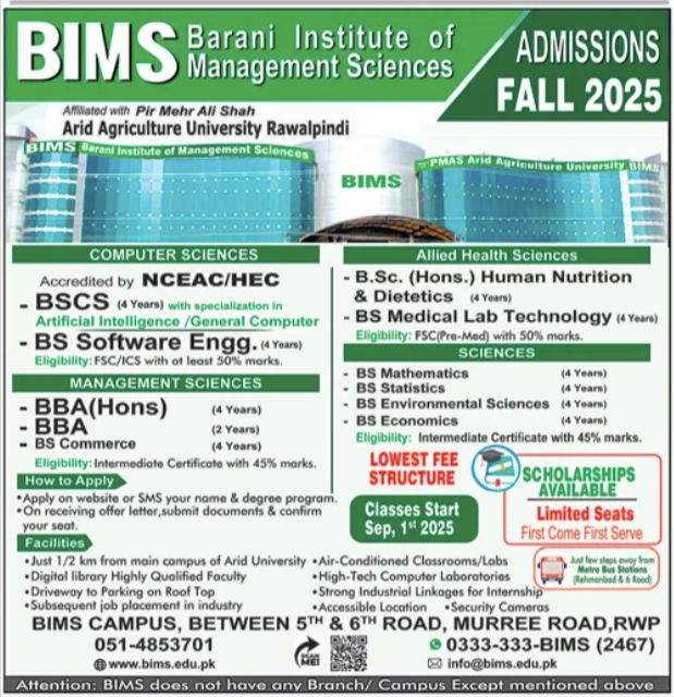 Barani Institute of Management Sciences BIMS admissions 2025 for BSCS. BS. BBA, MS has been announced. Students can enroll for admissions in Barani Institute of Management Sciences BIMS Rawalpindi Punjab Pakistan for academic year 2025 to continue campus based or online education in Business College. Students for admissions in can apply for online or campus classes as per Government institute criteria till admission closing date. Read newspaper ad for exact details.