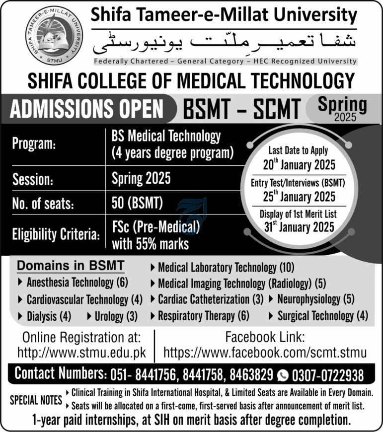 Shifa College of Medical Technology BSMT, SCMT admissions 2024 has been started. Students can enroll for admissions in Shifa College of Medical Technology Islamabad Islamabad Pakistan for academic year 2024 to continue campus based or online education in Medical AIOU. Eligible students for fulfilling criteria for admissions in can enroll as per Private admission policy 2024 till closing date. Read newspaper ad for exact details.