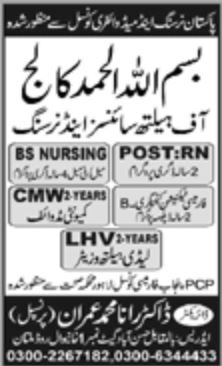 Bismillah College of Nursing has announced admissions 2025 for BSN . Students who want to take admissions in Bismillah College of Nursing Multan Punjab Pakistan for academic year 2025 to continue education in Medical College can apply. Eligible students for fulfilling criteria for admissions in can enroll as per Private admission policy 2025 till closing date. Read newspaper ad for exact details.