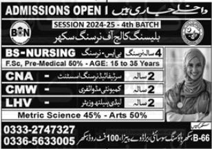 Blessing College of Nursing has announced admissions 2025 for BS-Nursing. Blessing College of Nursing Sukkur Sindh Pakistan welcomes students to apply for admissions in academic year 2025 in Science College. Students for admissions in can apply for online or campus classes as per Private institute criteria till admission closing date April 15, 2025. Read newspaper ad for exact details.