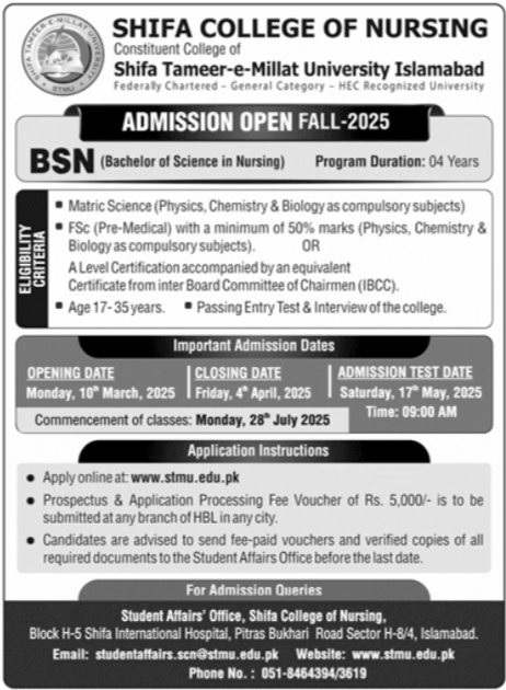 Shifa Tameer e Millat University STMU has announced admissions 2025 for BSN. Students who want to take admissions in Shifa Tameer e Millat University STMU Islamabad Islamabad Pakistan for academic year 2025 to continue education in Medical University can apply. Eligible students for fulfilling criteria for admissions in can enroll as per Private admission policy 2025 till closing date. Read newspaper ad for exact details.