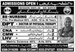Blessing College of Nursing bsn admissions 2025 has been started. Students who want to take admissions in Blessing College of Nursing Sukkur Sindh Pakistan for academic year 2025 to continue education in Science College can apply. Students for admissions in & criteria can apply as per Government institute admission policy 2025 before closing date as per advertisement. Read newspaper ad for exact details.