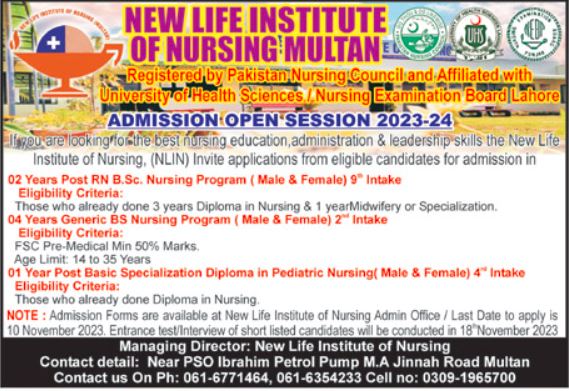 New Life Institute Of Nursing admissions 2023 for Bachelor of Science in Nursing BSN, Post Basic Diploma in Nursing has been announced. Eligible students who qualify as per admission criteria in New Life Institute Of Nursing Multan Punjab Pakistan can apply in Medical University for academic year 2023. Students who want to enroll for academic session 2023 in BSN and Diploma qualification and admission criteria for Private institute can apply till last date 10 November 2023. Read newspaper ad for exact details.