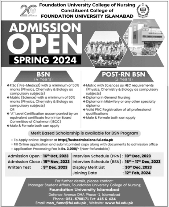Foundation University Islamabad BSN, Post RN BSN admissions 2023 has been started. Eligible students who qualify as per admission criteria in Foundation University Islamabad Islamabad Islamabad Pakistan can apply in Medical University for academic year 2023. Eligible candidates for admissions in Others and BSN can apply as per Private institute criteria and before closing date 15 November 2023 after reading advertisement online. Read newspaper ad for exact details.