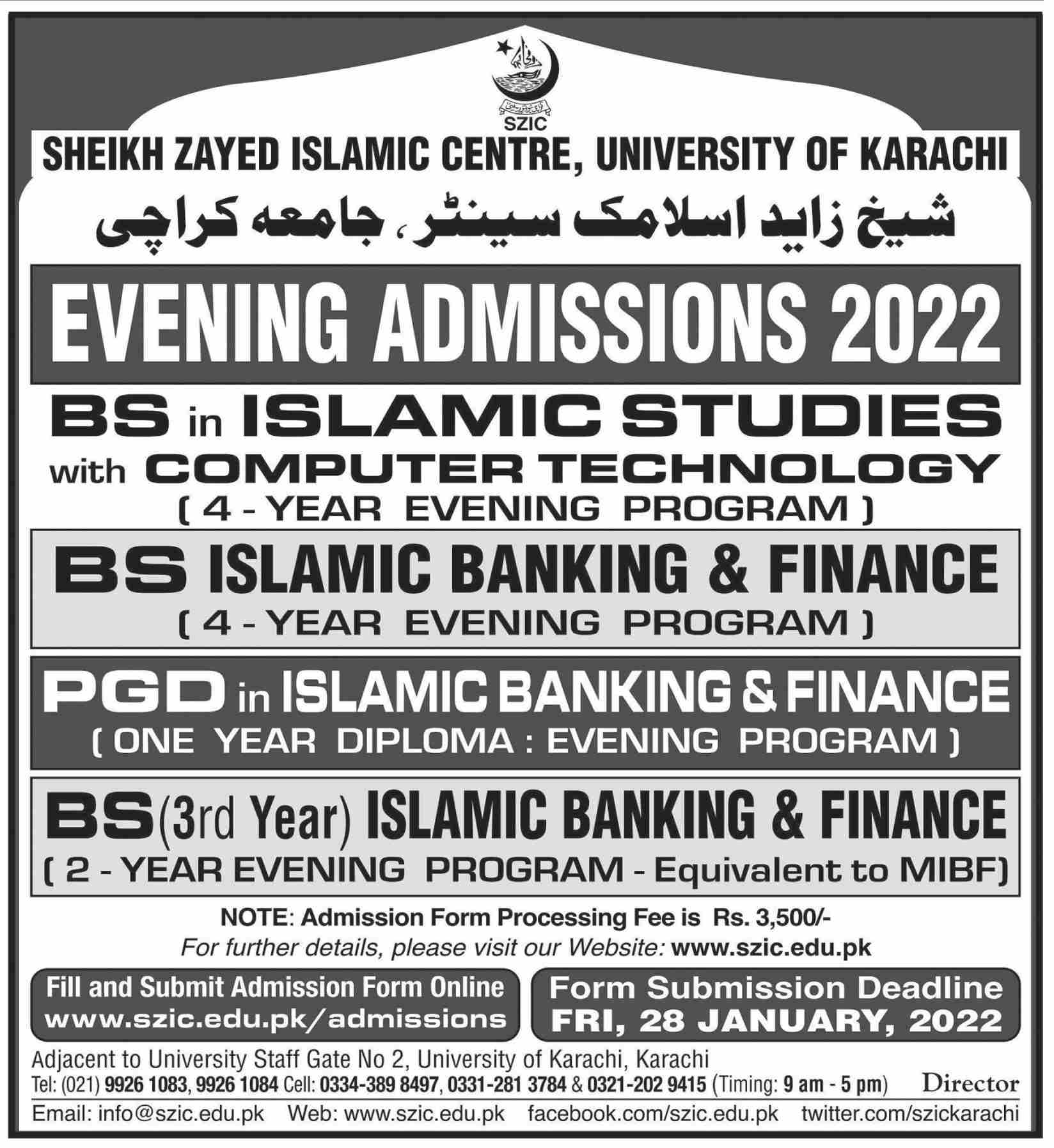 Sheikh Zayed Islamic Centre admissions 2022 for BS Islamic Studies, BS Islamic Banking and Finance, PGD has been announced. Students who want to take admissions in Sheikh Zayed Islamic Centre Karachi Karachi Sindh Pakistan for academic year 2022 to continue education in Other University can apply. Students who want to enroll for academic session 2022 fulfilling P.G Diploma, Bachelor and BS qualification and admission criteria for Government institute can apply till last date 28 January 2022. Read newspaper ad for exact details.