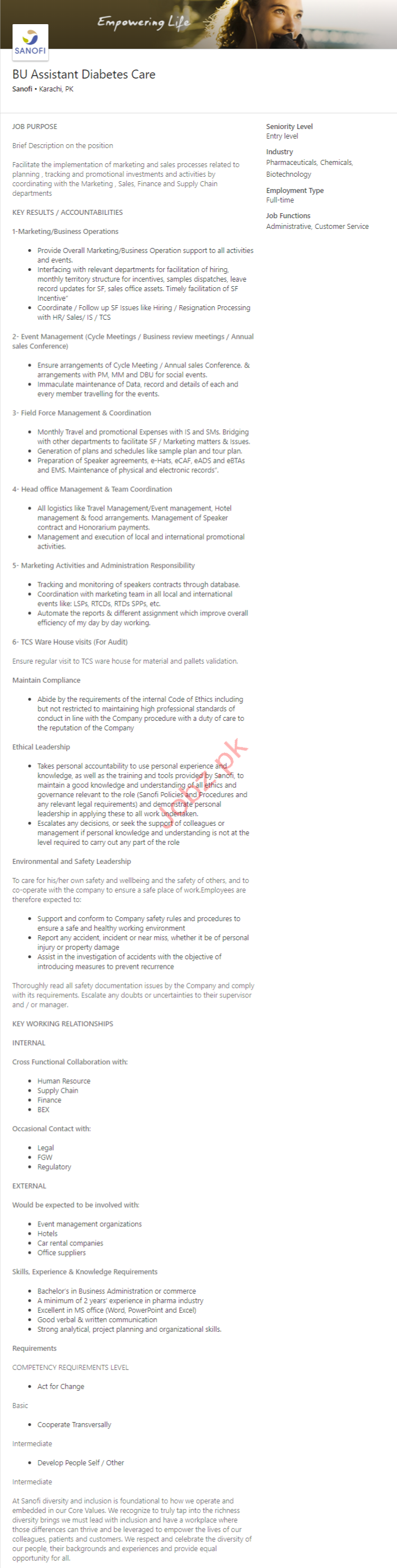 Latest Sanofi Pharmaceutical Company Management Posts Karachi 2025