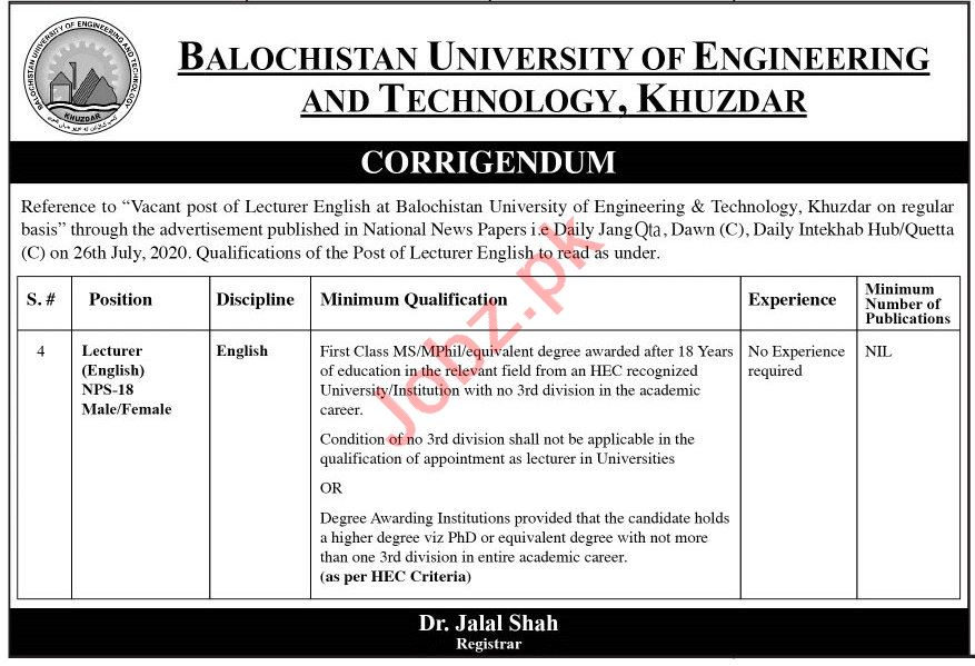 BUET University Khuzdar Jobs 2020 For Lecturer English